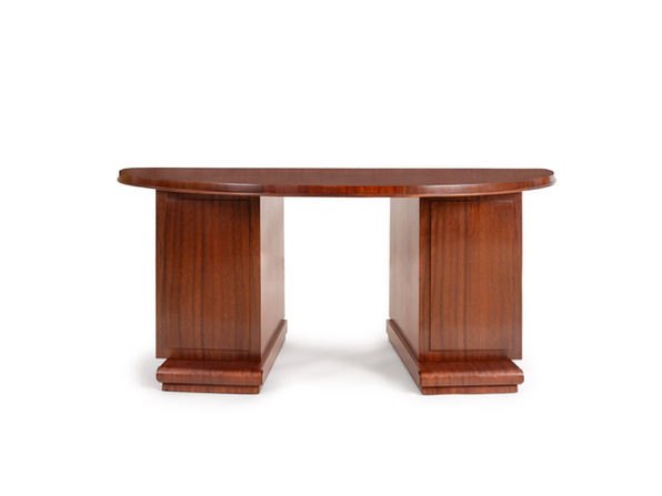 A mahogany desk, designed by Émile-Jacques Ruhlmann and edited by Alfred Porteneuve. Semi-circular top resting on two drawer units with silvered bronze handles.