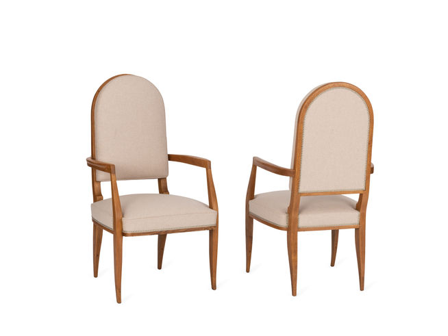 Pair of large bridge armchairs in solid oak , flat slightly inclined hight back, curved base and armrests with flat decorated oversleeves covering the front uprights.