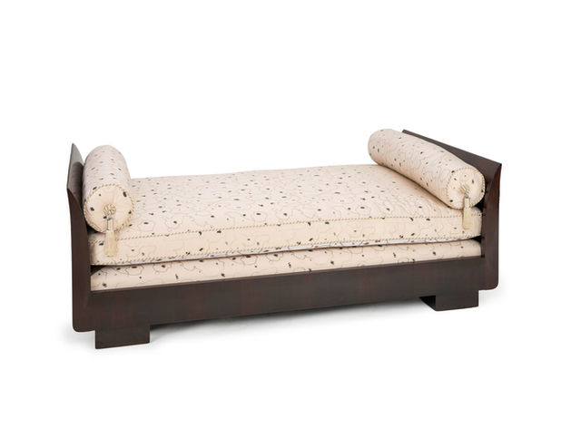 'Ruhl' model daybed in walnut, with a curved headboard. Upholstered in a fabric by Maison Prelle after a design by Émile-Jacques Ruhlmann.