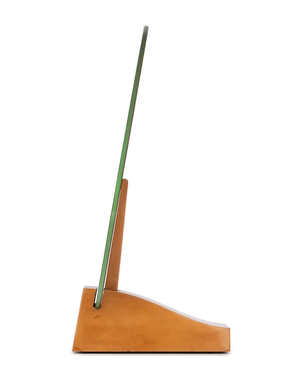 Rare dressing table mirror with trapeze-shaped base in sycamore veneer.